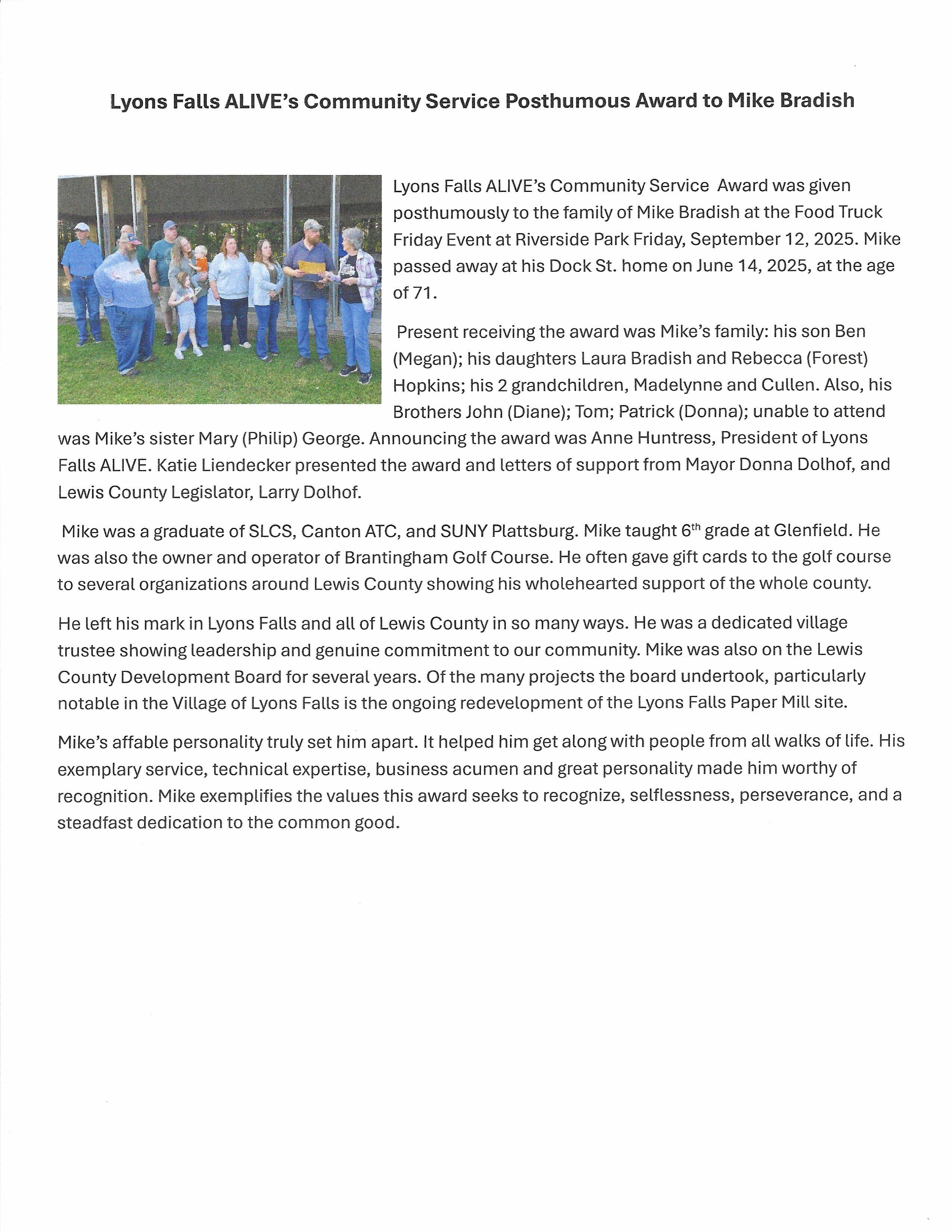 We invite you to become a member to help support Lyons Falls ALIVE. Download our membership form, or call Donna Dolhof, 315-348-6487, or any of the Executive Board members. $5/year or $50 lifetime, or $90 for a couple's lifetime membership.